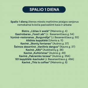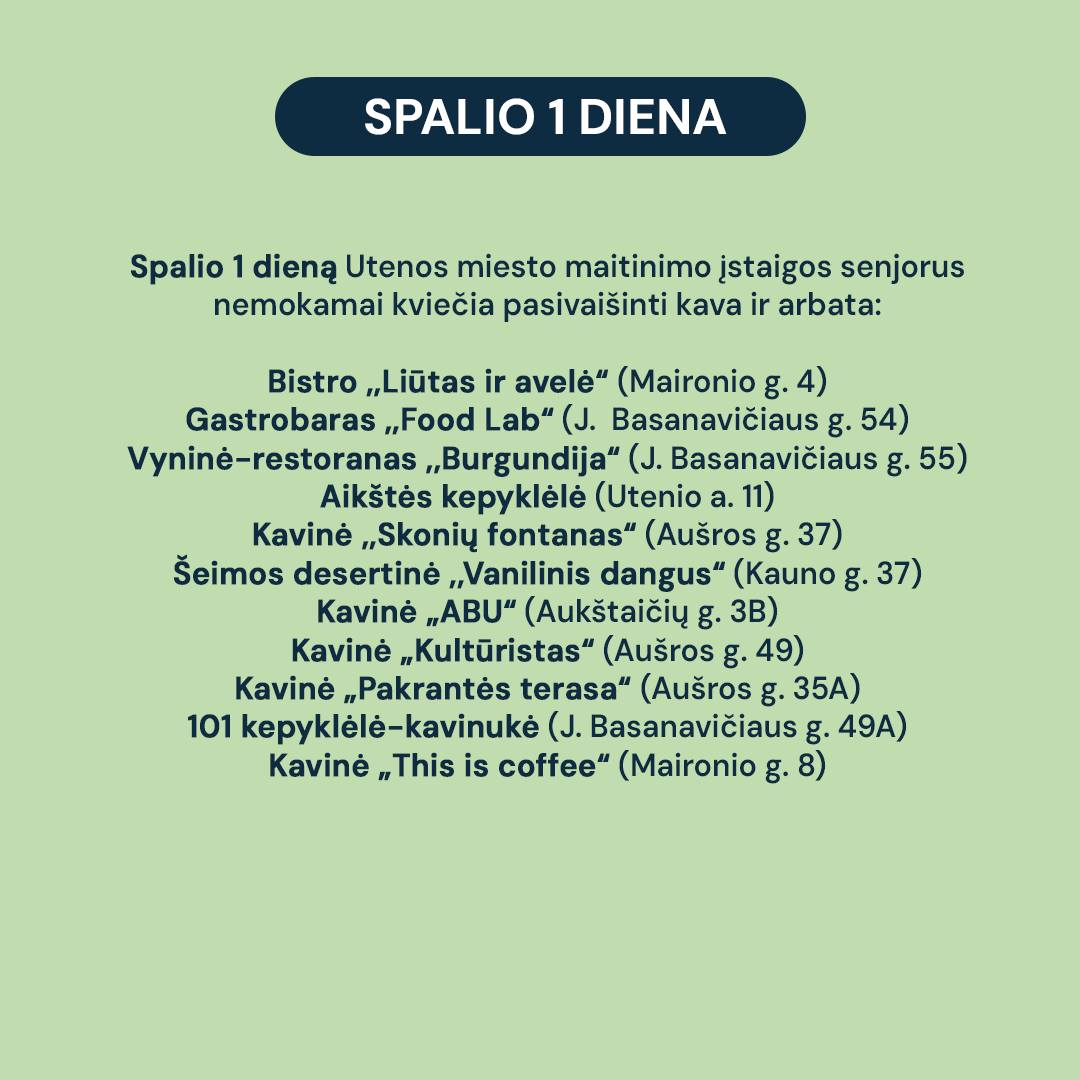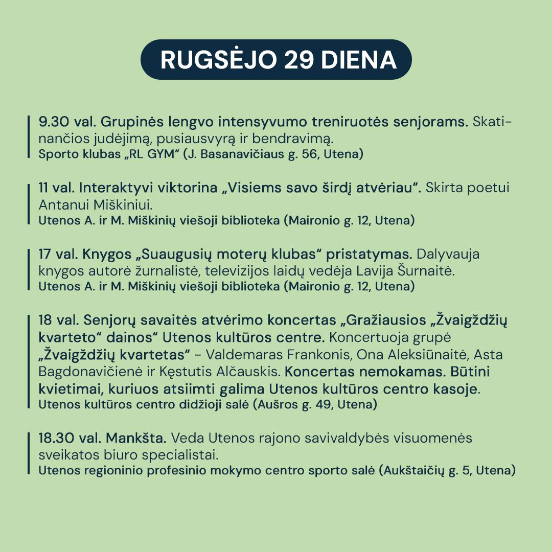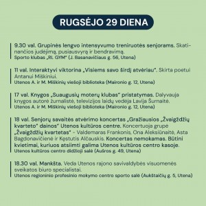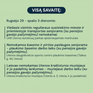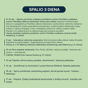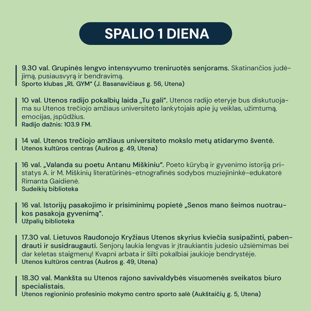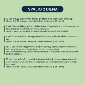 UTENOS A. IR M. MIŠKINIŲ VIEŠOSIOS BIBLIOTEKOS INFORMACINIO SKYRIAUS RENGINIAI, skirti visų fakultetų klausytojams: Spalio 2 d., 16 d. ir 30 d.nuo 11-12 val. kompiuterių klasėje Individualios konsultacijos išmaniųjų įrenginių naudojimosi klausimais.Spalio 2 d. 10 val. Knygų pristatymas – edukacija „Renkuosi emocijas“. Šeimos skaitmeninių veiklų centre. Būtina registracija tel. +370 389-61607 arba el. paštu: vaidakuncina@yahoo.comSpalio 7 d. 10 val. Edukacija „Žolynų magija pagal E. Šimkūnaitę“. Šeimos skaitmeninių veiklų centre. Būtina registracija tel. 0-389-61607 arba el. paštu: uvbiblioteka@gmail.comProgramoje protmūšis apie vaistinius augalus, išmanios programėlės augalų atpažinimui, floristinių skirtukų gamyba su epoksidine derva.Spalio 24 d. 11 val. orientacinis MIRKT žygis po Uteną. Renkamės bibliotekos 1 aukšte. Turėti išmanųjį įrenginį su interneto ryšiu (telefoną, planšetę). Būtina registracija tel. 0-389-61607 arba el. paštu: uvbiblioteka@gmail.comSpalio 27 d. 17 val. Utenos A. ir M. Miškinių viešosios bibliotekos konferencijų salėje pasakojimo vakaras „Kosmosas“ – dangaus kūnų istorijos. Ar žinote kas pakabino Saulę danguje, o naktį įjungė šviesti Mėnulį? Ar tikrai Danguje yra tiek žvaigždžių, kiek žmonių? Kodėl žvaigždynai pasirodo skirtingomis formomis? Atsakymų į šiuos klausimus, kartu su profesionalia istorijų pasakotoja Milda Varnauskaite, ieškosime mituose, įvairių kultūrų pasakojimuose ir lietuviškose sakmėse.