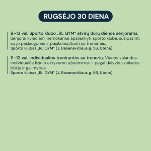 Utenos kultūros centro (Aušros g. 49) diskotekų salėje repetuos folkloro ansamblis „Seklytėla“ pirmadieniais nuo 10 val. iki 11.30 val., pradedame nuo spalio 6 d. vadovė Milda Morkūnaitė (morkunaitemilda@gmail.com; +37064337889), seniūnė Danutė Podelienė (danutepodeliene@gmail.com; +37067020984). Naujokams registruotis pas vadovę Mildą Morkūnaitę jos nurodytais kontaktais.