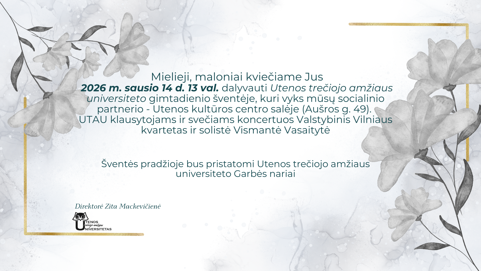 Maloniai kviečiame Jus, šeimos narius, draugus 2026 m. sausio 14 d. 13 val. dalyvauti Utenos trečiojo amžiaus universiteto gimtadienio šventėje, kuri vyks mūsų socialinio partnerio – Utenos kultūros centro salėje (Aušros g. 49). Koncertuos Valstybinis Vilniaus kvartetas ir solistė Vismantė Vasaitytė. Šventės pradžioje bus pristatomi Utenos trečiojo amžiaus universiteto steigėjai ir Garbės nariai.